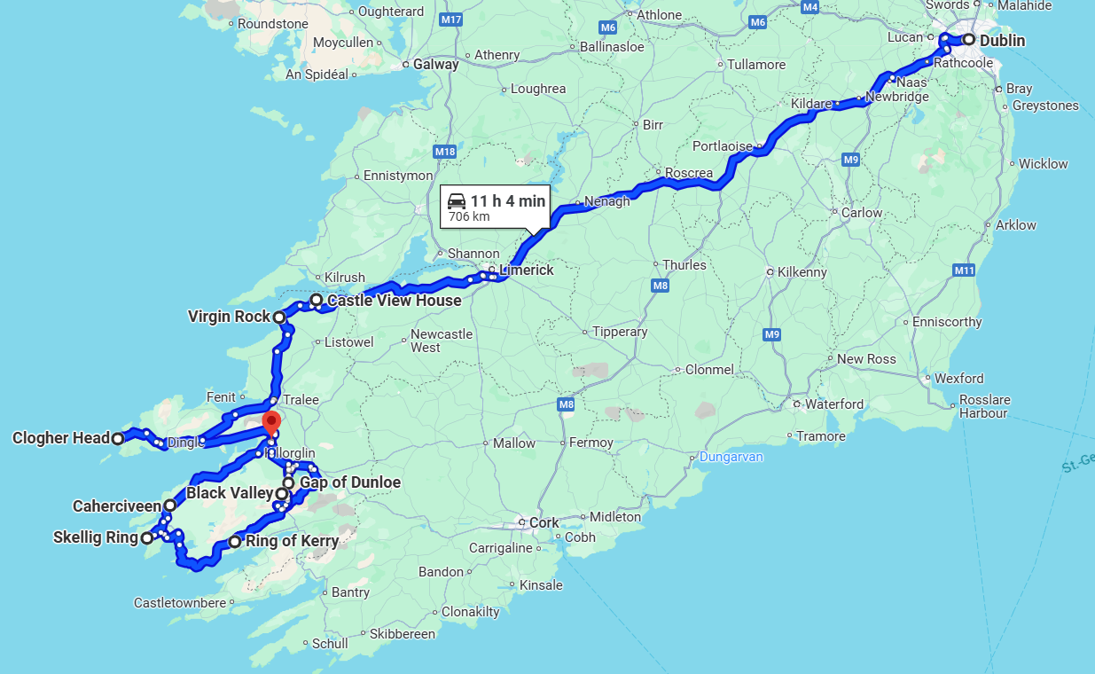 Im April 2016 landete ich nachmittags in Irlands Hauptstadt Dublin. Mit einem Mietwagen ging es für mich direkt nach der Landung Richtung Südwesten. Eine der ersten Herausforderungen erwartete mich sofort: Linksverkehr. Besonders in der Dunkelheit war es ungewohnt, sich auf der „falschen“ Straßenseite zurechtzufinden. Doch mit etwas Konzentration und einer Prise Abenteuerlust meisterte ich die Fahrt und erreichte spät am Abend meine erste Unterkunft, das Castle View House. Von hier aus sollte am nächsten Tag, nach einem ausgiebigen Irish Breakfast meine Erkundungs- und Fotografiereise starten. Auf der Karte siehst du die Route der ersten drei Tage. Im weiteren Verlauf des Beitrags erfährst du genauer, wo ich war und bekommst einige Einblicke in die wilde Natur Irlands im April.