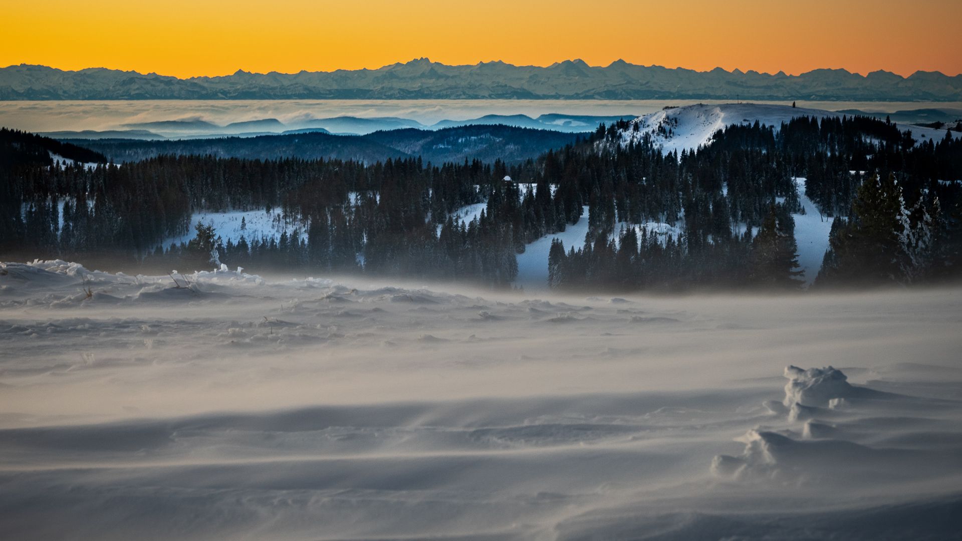 - ISO100, 70mm, f3.5, 1/6sek für die sanfte Weichzeichnung der Schneebedeckten Landschaft im Vordergrund.
