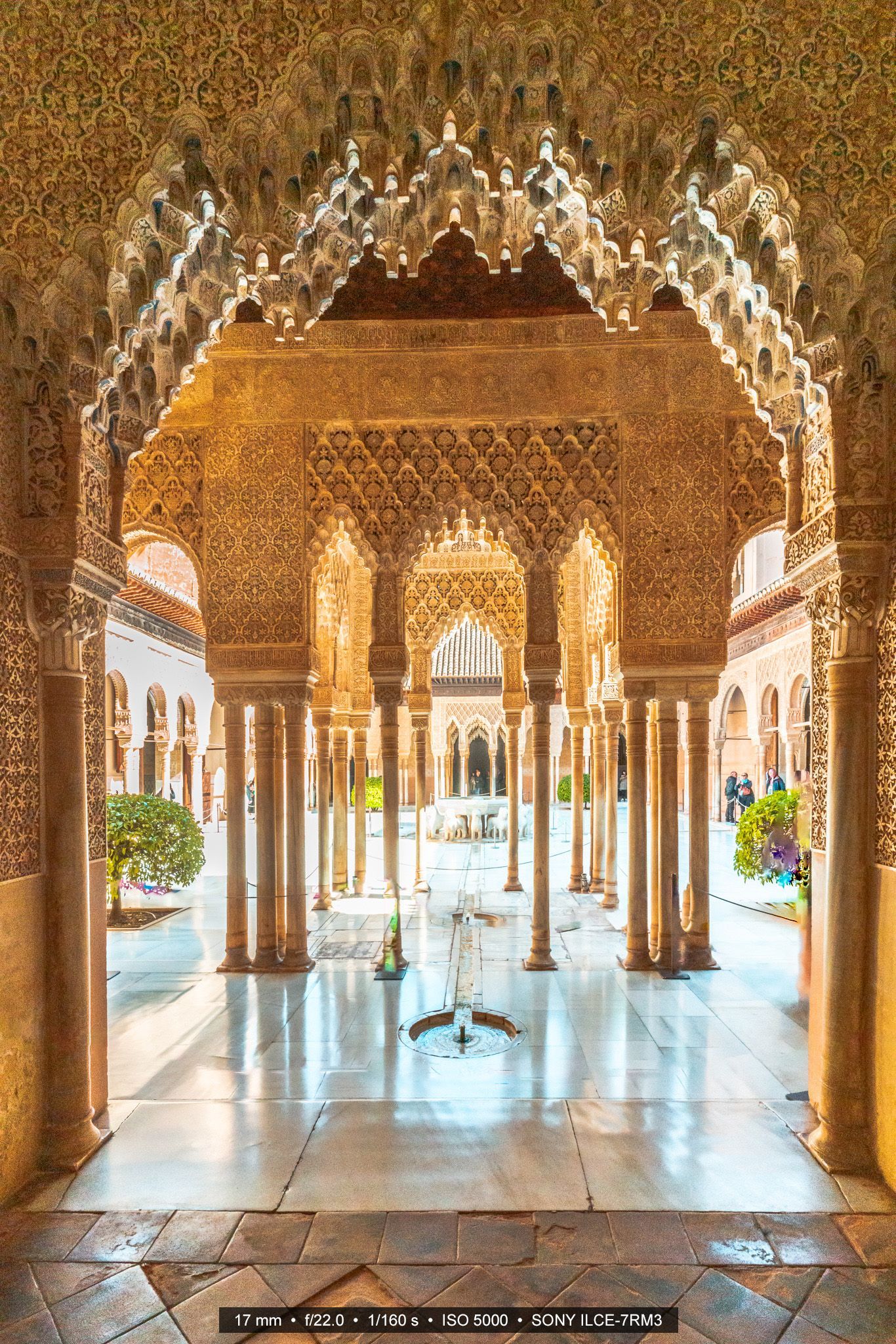 Fototipp: Ein Weitwinkelobjektiv (z.B. 17mm bei Blende 8-16) ist ideal, um Innenräume und Höfe symmetrisch zu erfassen. Bei geringem Licht helfen hohe ISO-Werte (bis 5000), wie im Löwenhof. Allerdings habe ich nicht auf die Blende geachtet, ein niedrigere Wert hätte auch ein scharfes Bild ergeben, dann hätte ich die ISO mit niedrigen Werten nutzen können.