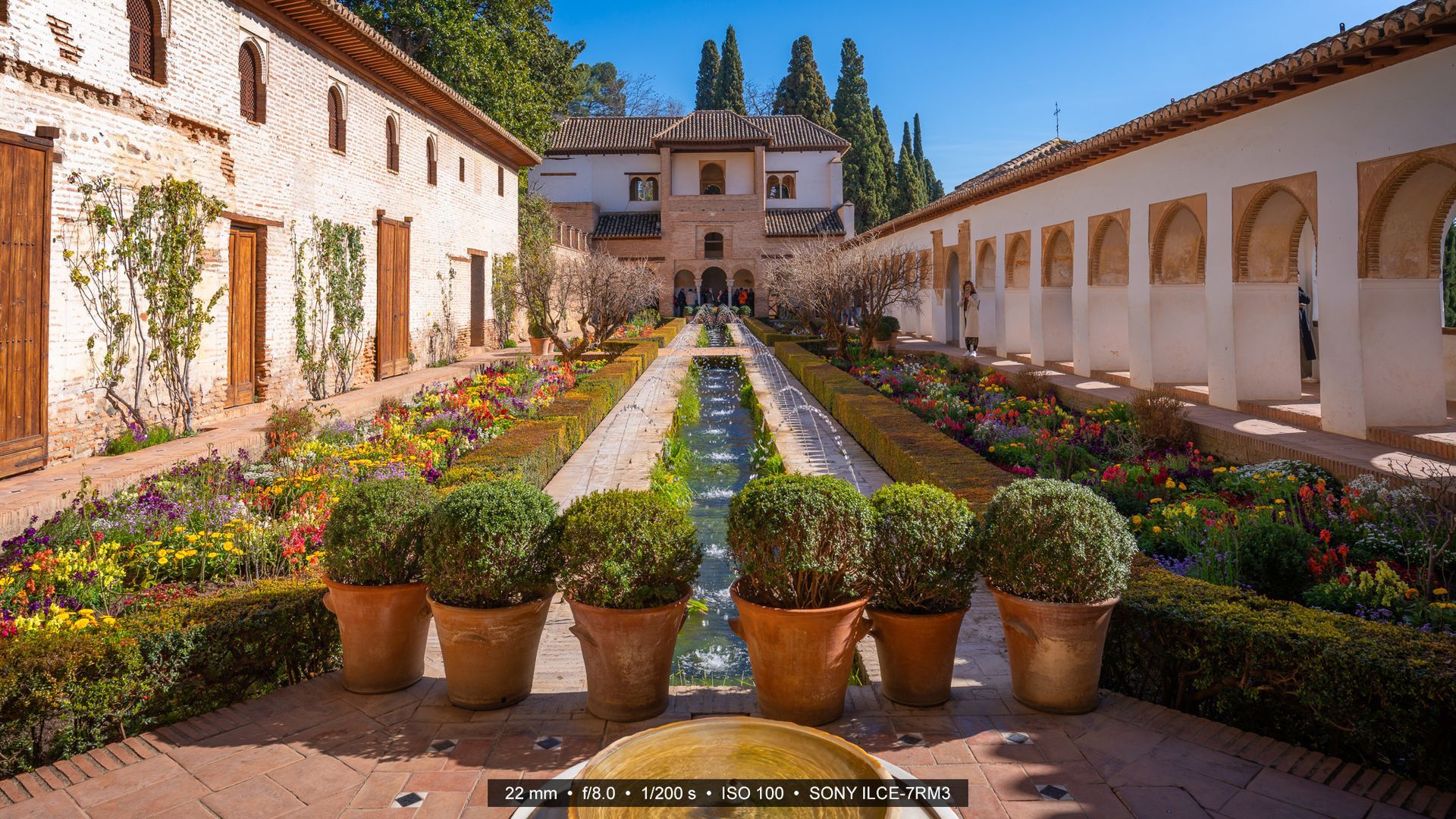 Der Generalife, genauer gesagt der Patio de la Acequia, ist der berühmteste Hof der Sommerresidenz der Nasridenherrscher innerhalb des Alhambra-Komplexes. Er liegt etwas abseits der Nasridenpaläste und war ursprünglich als Rückzugsort der Herrscher gedacht, ein Ort der Ruhe, Gärten, Wasserläufe und Arkadengänge. Ein langes Wasserbecken mit kleinen Springbrunnen zieht sich durch die Mitte, flankiert von farbenfrohen Blumenbeeten, akkurat geschnittenen Hecken und schattigen Wandelgängen.