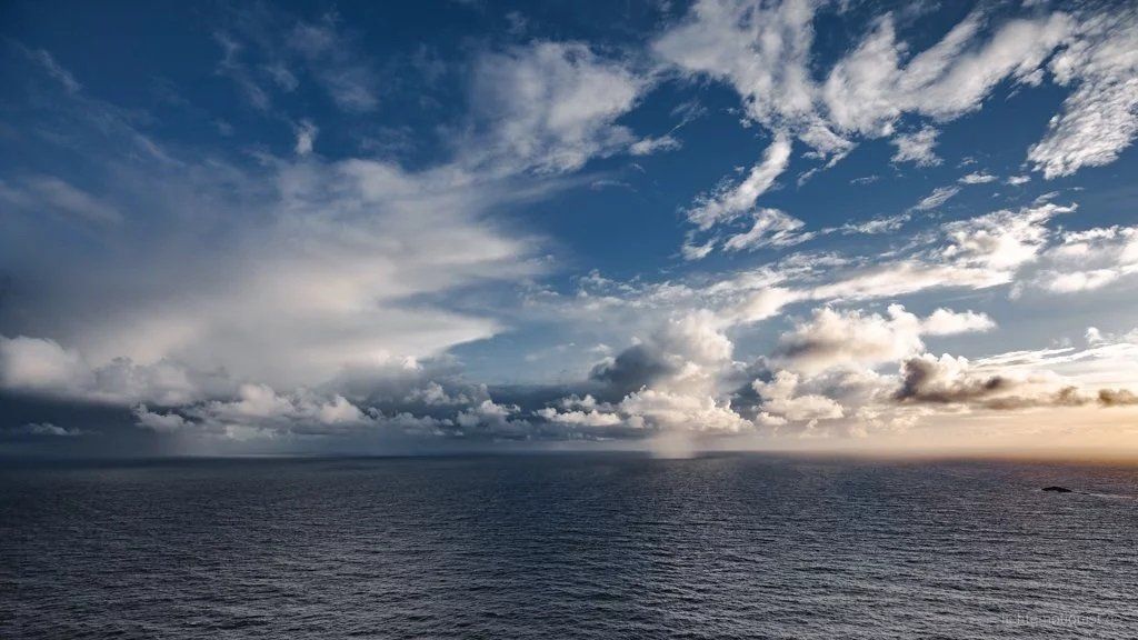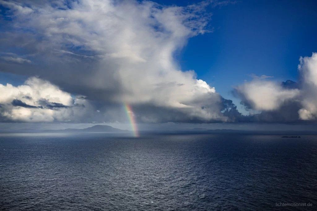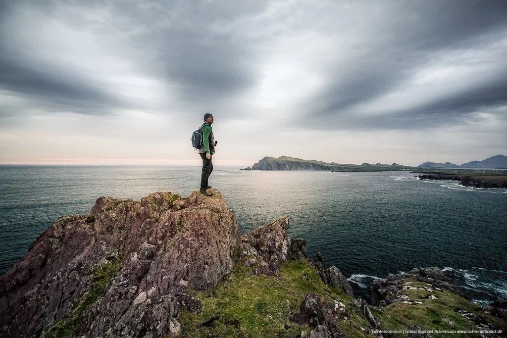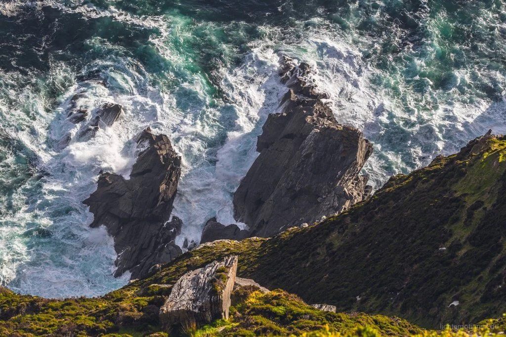 Nach dem kleinen Zwischenstopp fahre ich weiter bis zu meiner nächsten Unterkunft “Atlantic Breeze”. Dort packe ich kurz aus, mache ein kleines Päuschen, danach fahre ich zum “Keem Strand” und beginne mit dem Aufstieg des “Moyteoge Head”. Das letzte Stück ist sehr sportlich, da mich ein kräftiger Regenschauer überrascht und ich die letzten Meter, bis zu einem verfallenem Aussichtshaus, spurte, um dort kurz Schutz zu suchen, da ich den Regenschutz für meine Fotoausrüstung nicht mit hatte. Als der Schauer aufhört bietet sich mir das Paradies jedes Fotografen, vor allem für mich als Lichtemotionist. Ein Spiel zwischen Wolken, Licht, Wasser und einer grandiosen Aussicht. Tolle Lichtstimmung. Was will man mehr