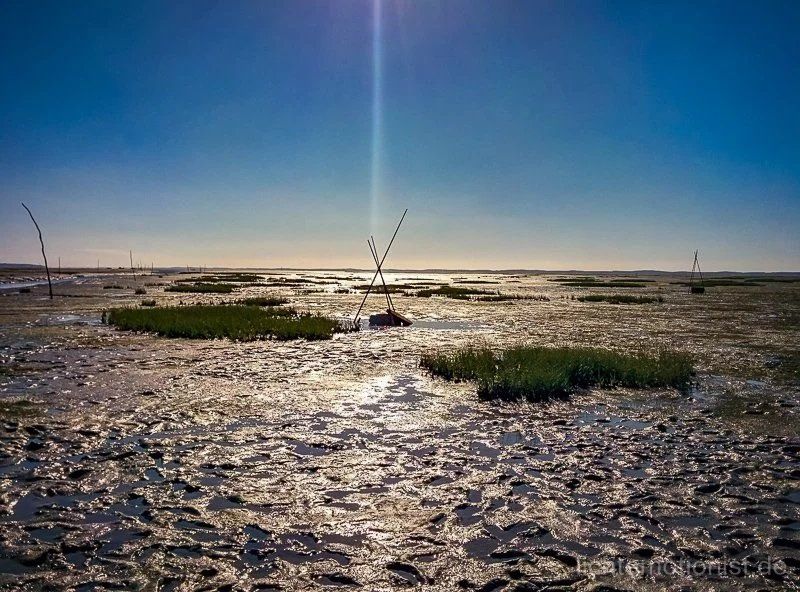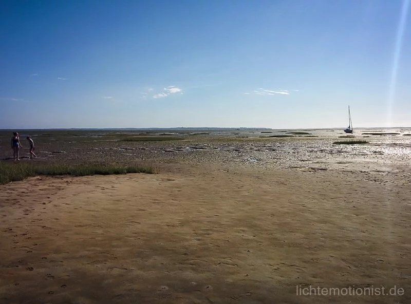 Danach ist eine kleine Entdeckungstour angesagt und wir machen uns auf dem Weg zum Strand. Dort angekommen staunen wir nicht schlecht, wo ist das Meer? Vor uns liegt ein großer Strand, aber nirgends ist das Meer zu sehen. Erst als wir ganz genau hinschauen, sehen wir einen leichten Schimmer am Horizont, das kann doch nicht sein. Tatsächlich hat es hier eine extreme Ebbe und das ausgerechnet an unserem ersten Tag und wenn man nachliest, erfährt man, dass dies eine große Bucht mit einem Binnenmeer ist, man lernt ja nie aus. Wir spazieren also am Strand entlang und durch das Watt.