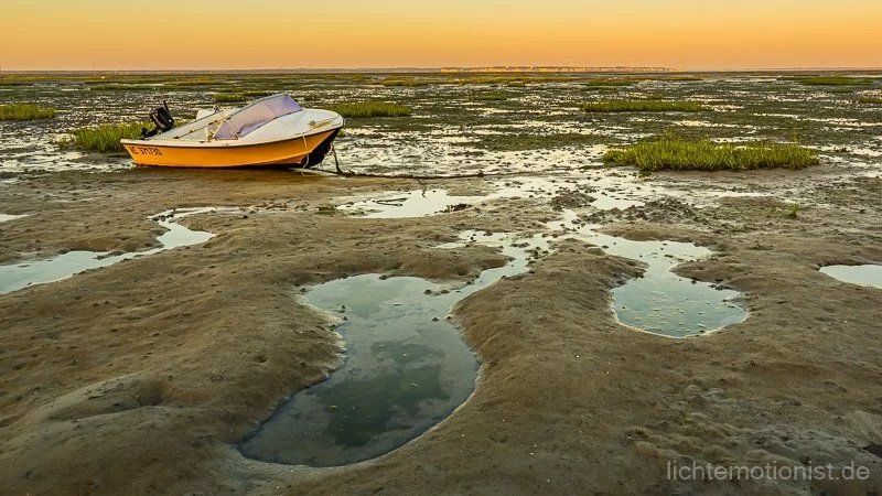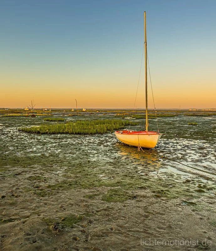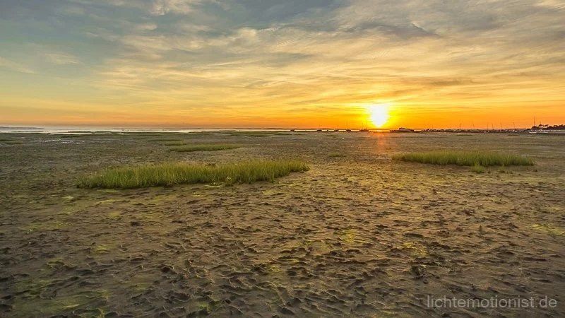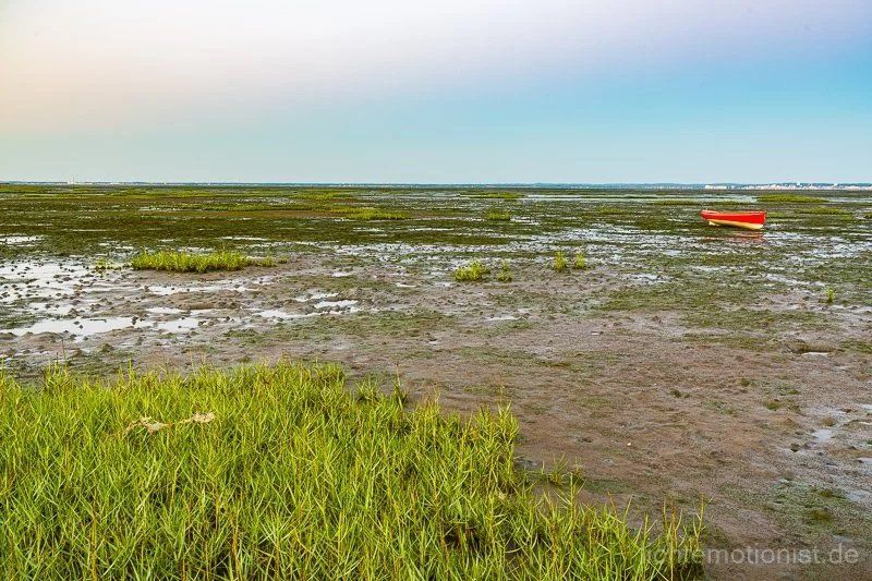 Ich bin wieder als erster wach und mache deswegen einen kleine Fotoausflug, zum Sonnenaufgang, an den Strand. Ich bin ganz alleine am Strand – fast allein – ein paar Enten und Möwen leisten mir Gesellschaft. Das Meer, das wir am Vorabend gesichtet haben, ist wieder verschwunden, lediglich ein paar Pfützen weisen darauf hin, dass es mal da war. Die Boote liegen alle auf dem Watt. Hat etwas Beruhigendes.