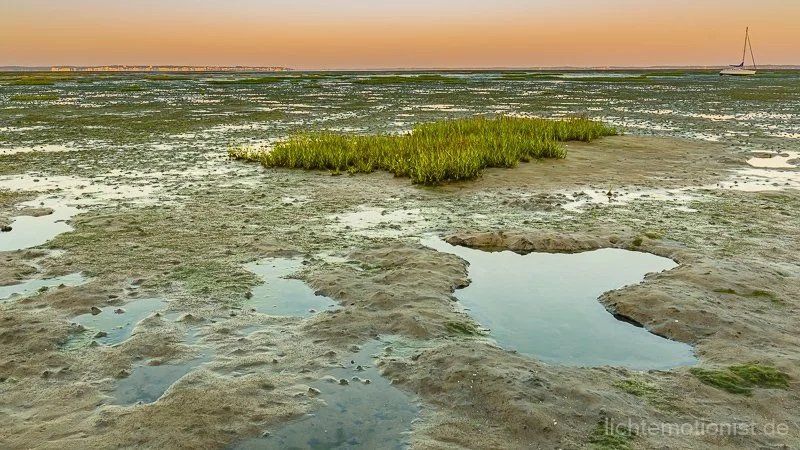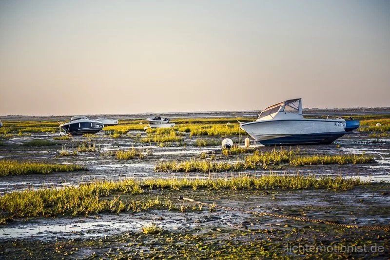 Jetzt ist das Meer angestiegen und man sieht es mal. Allerdings ist es zu flach zum Baden. Es sieht lustig aus, wie die kleinen Grasflächen, teilweise noch aus dem Wasser schauen. Kaum ist das Wasser da, herrscht ein reger Bootsbetrieb und viele machen Wassersport. Als wieder Ebbe herrscht, machen wir eine Wattwanderung und versinken ziemlich weit im Schlamm – bis zu den Waden. Was eine witzige Erfahrung ist und alle zum Lachen bringt, weil jeder rumläuft, wie ein Storch im Salatbeet. 😀 Danach sehen wir aus wie kleine Ferkel und müssen erstmal zurück um uns waschen – das Meer ist ja wieder mal weg… ;D