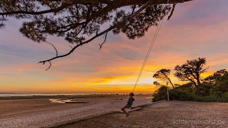 So gestern hatte ich Abends keine Kamera dabei und der Sonnenuntergang war überragend, heute kann man auch schon einen super Sonnenuntergang erahnen. Amelie geht wieder mit, denn sie möchte nochmal auf der großen Schaukel am Strand schaukeln. Ich lag mit meiner Vermutung richtig, der Himmel brennt und bietet ein einzigartiges Lichtspektakel.
