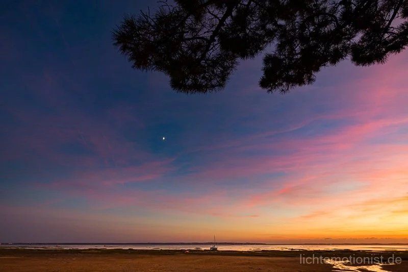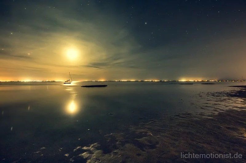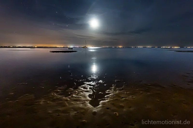 Als wäre das nicht schon genug, zeigt sich der Mond und macht die Nachtaufnahmen perfekt. Pünktlich zum Aufgang des Mondes, ist dann auch das Wasser wieder da, so das ich noch super Spiegelungen im Bild habe. Das Wasser sieht durch die Langzeitbelichtung so glatt aus!