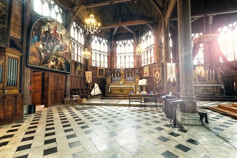 Sainte-Catherine ist die größte Holzkirche Frankreichs und wurde schon im 15. Jahrhundert erbaut, nachdem die Vorgängerin während des hundertjährigen Kriegs abbrannte. Da erstens die Kenntnisse eine Steinkirche zu bauen fehlten und zweitens kein anderes Material, außer Eichenstämme, zur Verfügung standen, baute man einfach ein Schiff, welches danach umgedreht wurde.