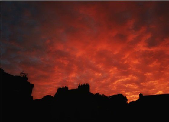 Am Abend zurück in Honfleur bietet sich ein wunderschöner, knallroter Sonnenuntergang und als Abschluss des Tages, essen wir noch einen Crêpe.