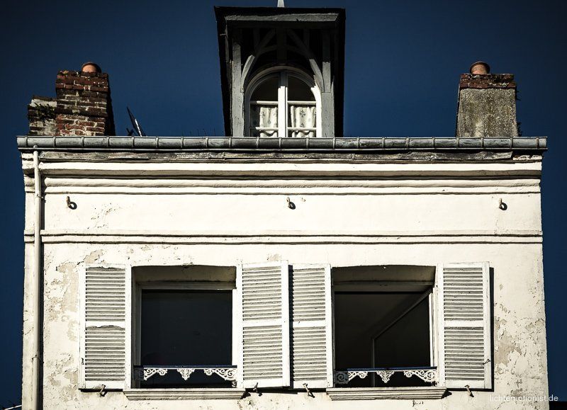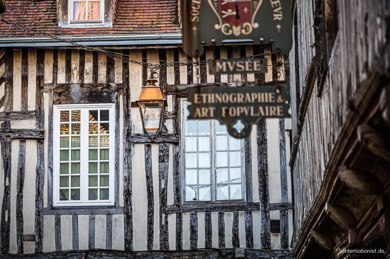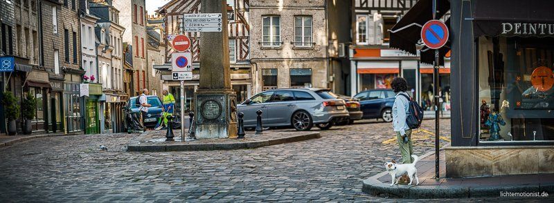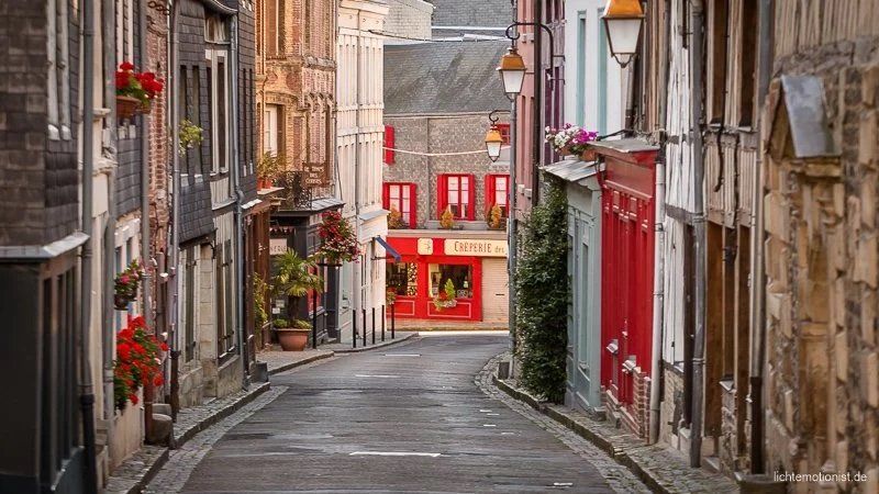 Der letzte Tag in Honfleur. Ich bin wieder vor dem Frühstück mit meiner Kamera unterwegs. Wenn ich aus unserer Ferienwohnung komme, ist das die Straßenansicht, am Ende sieht man ein Crepes Cafe, hier haben Alicia und Amelie immer unseren Nachtisch geholt.