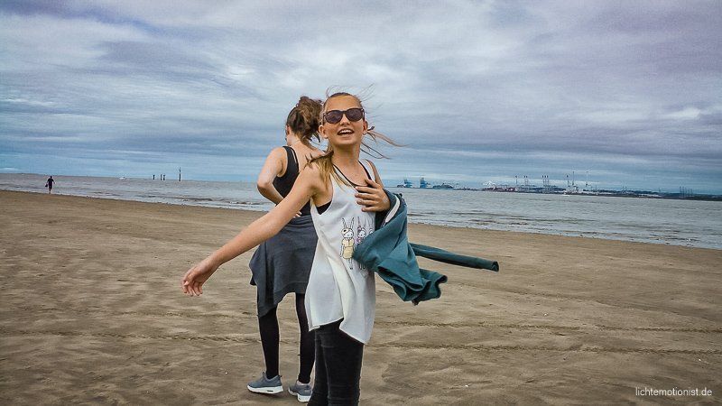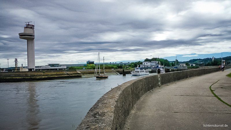 Dann laufen wir weiter durch die Stadt zur Hafenpromenade, schauen den Booten beim Ein- und Ausfahren zu. Wir spazieren an der Promenade entlang weiter zum Strand. Dieser ist ein ganzes Stück von der Innenstadt entfernt. Es ist gerade Ebbe und das Wetter lädt nicht sehr zum Baden ein. Trotzdem sind einige Menschen im Wasser. Brrrr.