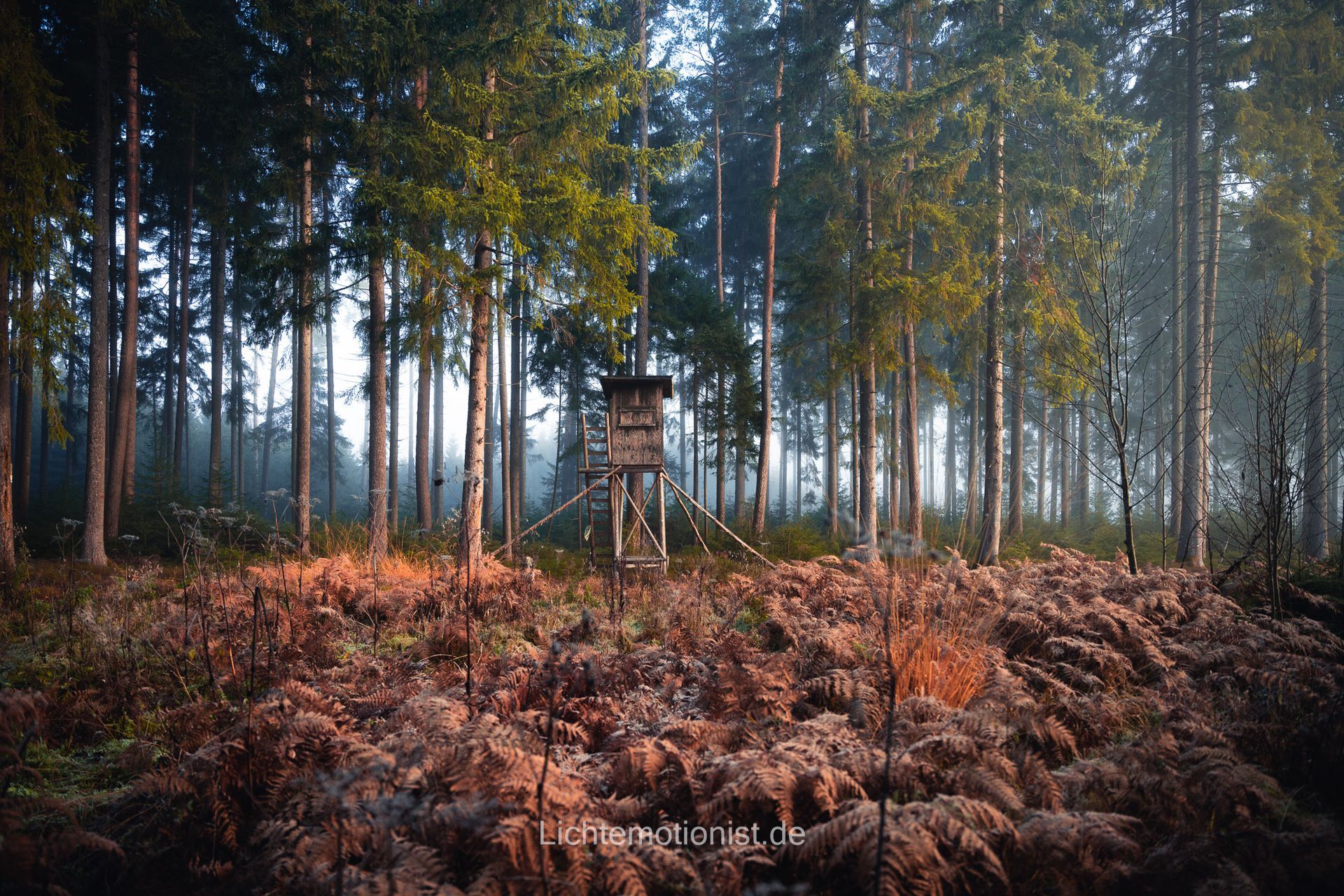 Ein weiterer erhabener Moment war, als ich einen Waldrand mit Farnen und einem Jägerstand erreichte. Die Sonne stieg höher, und die Lichtverhältnisse veränderten sich. Ich entschied mich, tiefer in den Wald zu gehen, wo der Nebel zwischen den Bäumen hing und das Licht weicher machte. Es war wie eine natürliche Lichtbox – perfekt für ruhige und atmosphärische Bilder. An manchen Stellen spiegelten sich die Sonnenstrahlen in gefrorenen Spinnweben, und ich versuchte, diese Details in den Vordergrund meiner Fotos zu rücken.