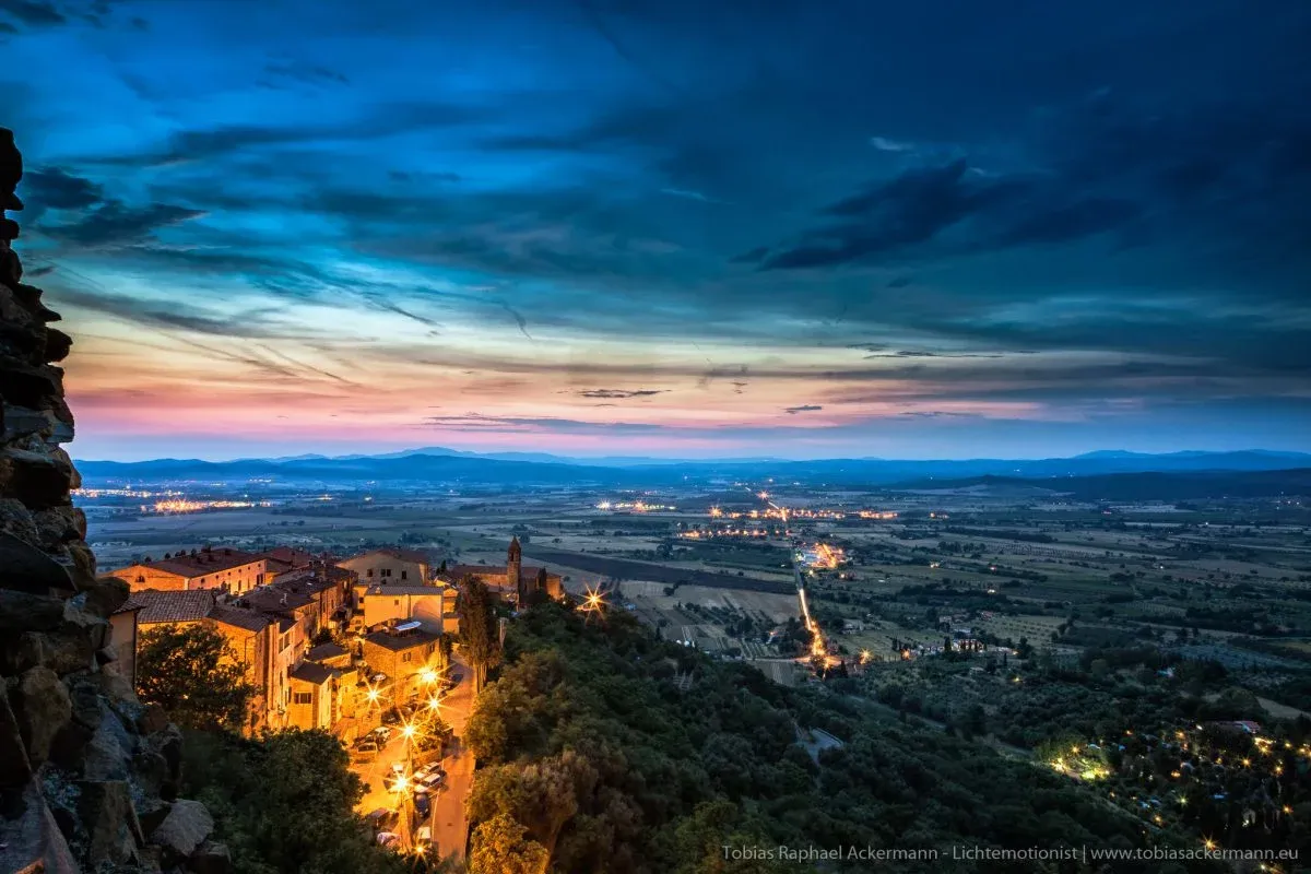 Toskana Scarlino. Mit RAW-Dateien können mehr Details und damit auch mehr Tonwerte besser wiedergegeben und bearbeitet werden. Diese Bild ist eine Langzeitbelichtung (25 Sekunde), weil ich die Blende ziemlich geschlossen hatte, um maximale Schärfe von hinten bis vorne zu erhalten. Das geht natürlich nur mit Stativ. Grund warum ich maximalen Schärfe haben wollte, waren die Steine auf der Linken Seite, die als “Bild”-Rahmen dienten und auch noch Scharf sein sollten.