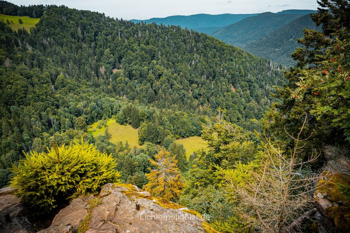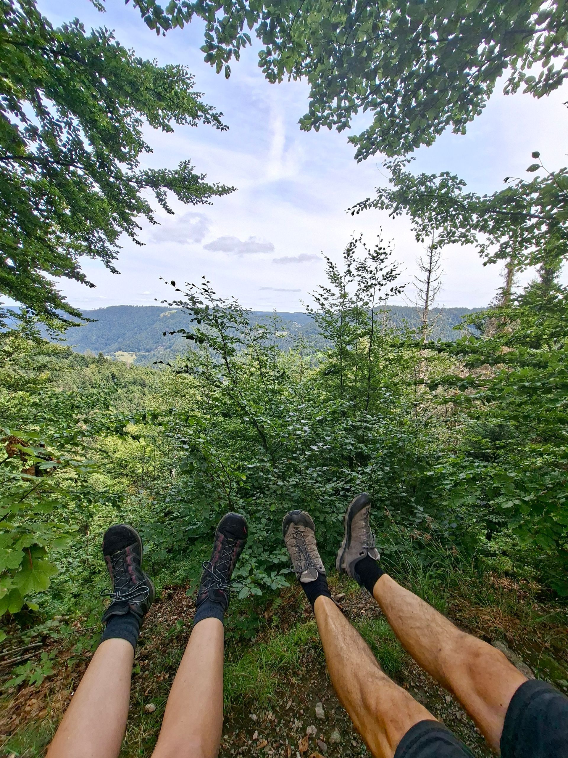 Irgendwann kommen wir an einer weiteren kleinen Abzweigung vorbei und wir sind neugierig. Von Neugier gepackt kommen wir an einem Felsvorsprung an, dem Hochwartfelsen, der uns eine tolle Aussicht über den Schwarzwald bietet. Hier beschlossen wir unsere Mittagspause einzulegen und stellten die Rucksäcke ab, aßen gemütlich unser Mittagessen und genossen die Aussicht, alles unter blauem Himmel, mit dem Rauschen des Wassers in den Ohren. Wir achteten trotzdem auf eine gewisse Distanz zum Abgrund, da der Felsen nicht gesichert ist und das alte Geländer nur noch in Resten zu erkennen ist. Nach unserer Pause kehren wir zurück in den schützenden Rhythmus des Waldes.