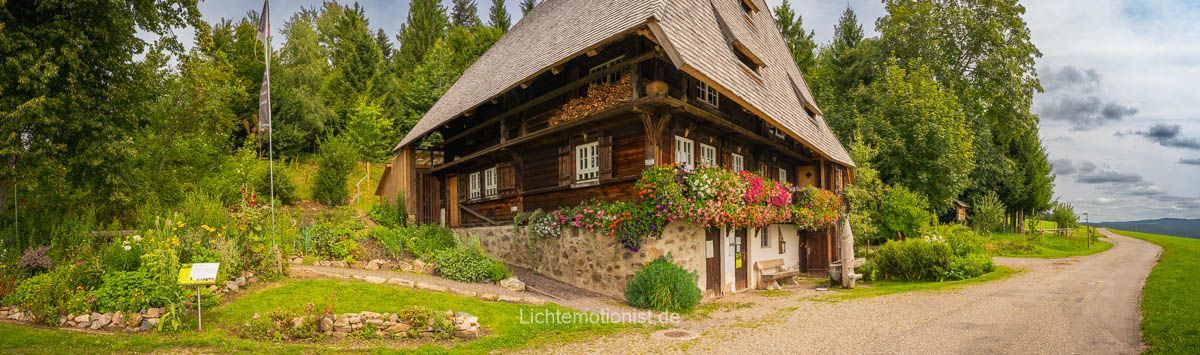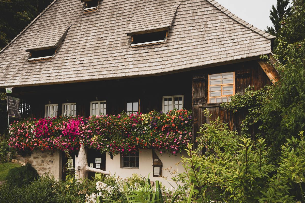 Die Wanderung hatte Alicia bei Komoot rausgesucht. Sie wurde als schwer eingestuft, war etwa 11,7 Kilometer lang, sollte knapp vier Stunden gehen und um die 430 Höhenmeter auf- und abwärts gehen. Kurze alpine Stücke setzen laut Plattform Trittsicherheit und feste Schuhe voraus. Ich bin gespannt, denn es hört sich herausfordernd und nach einer Challenge an. Doch erstmal müssen wir raus aus St. Märgen. Die ersten Meter sind freundlich und geben Zeit, in das Wandern hineinzufinden. Als ersten Wegstop passieren wir die Rankmühle, die an einem asphaltiertem Weg steht. Ein altes Schwarzwaldhaus mit Holzschindeln und Mühlrad, sowie den klassischen Geranien blühend vor dem Haus.