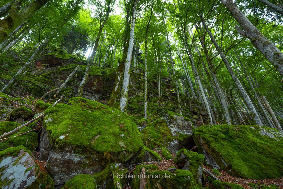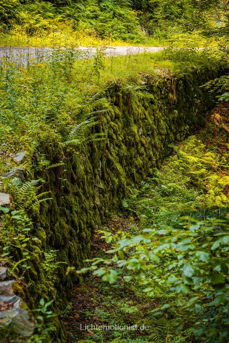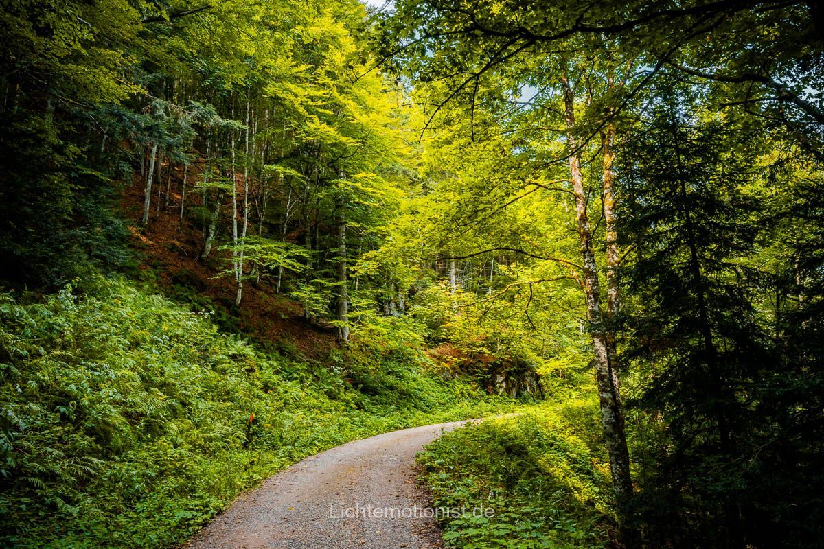 Als wir bemerkten wie viel Zeit schon vergangen ist, setzten wir unsere Reise etwas zügiger fort und übersahen dabei zuerst unsere nächste Abzweigung, weil sie so unscheinbar war. Ein schmaler Pfad weiter in den Bannwald hinein und sofort ist man von Schatten und Stille umgeben. Unter den Schuhen nun weicher Waldboden, ein Trampelpfad über Wurzeln und Steine, vorbei an Moos und Farnzweigen. Es geht bergab hinein in die Schlucht.