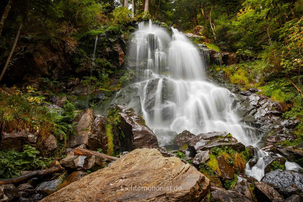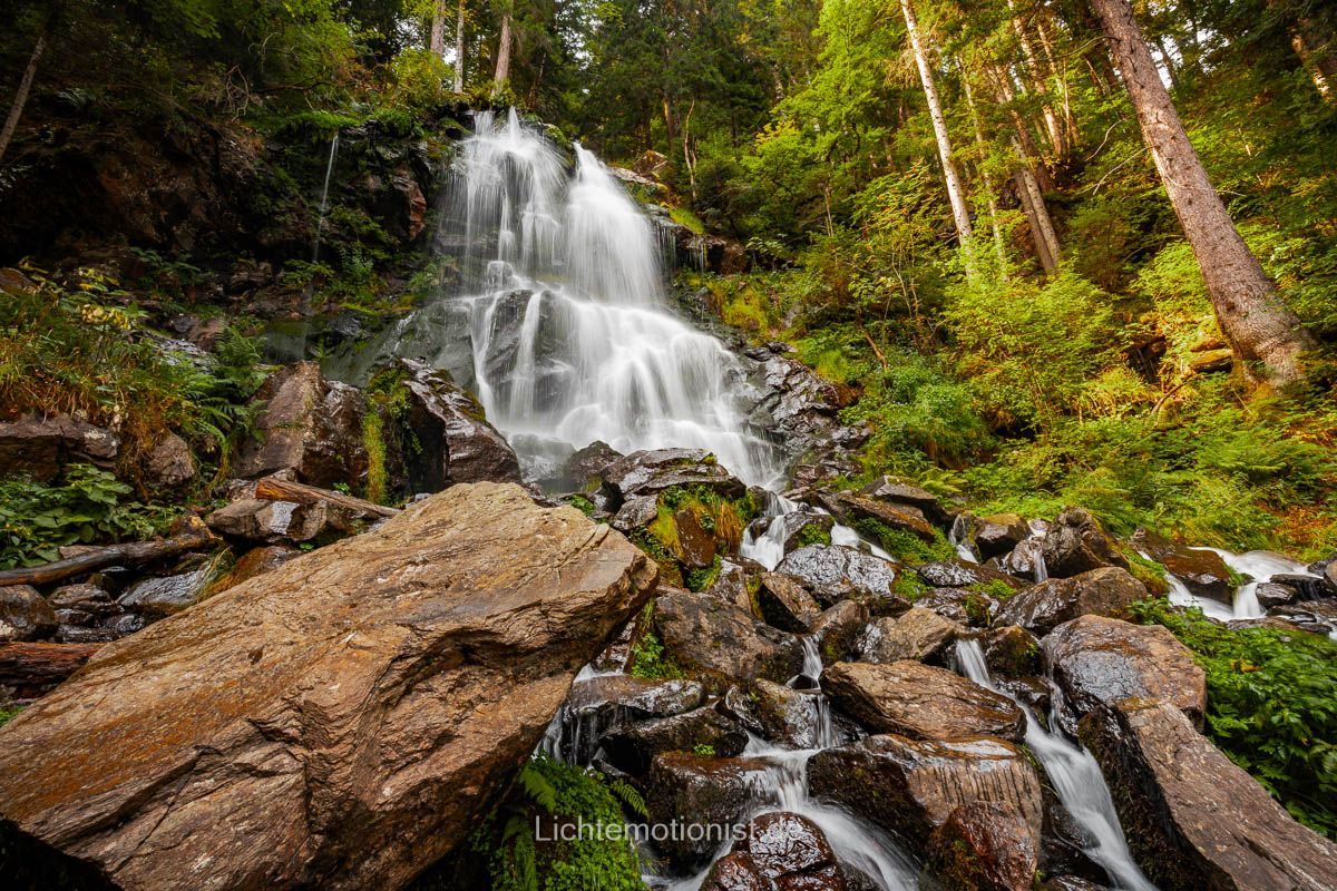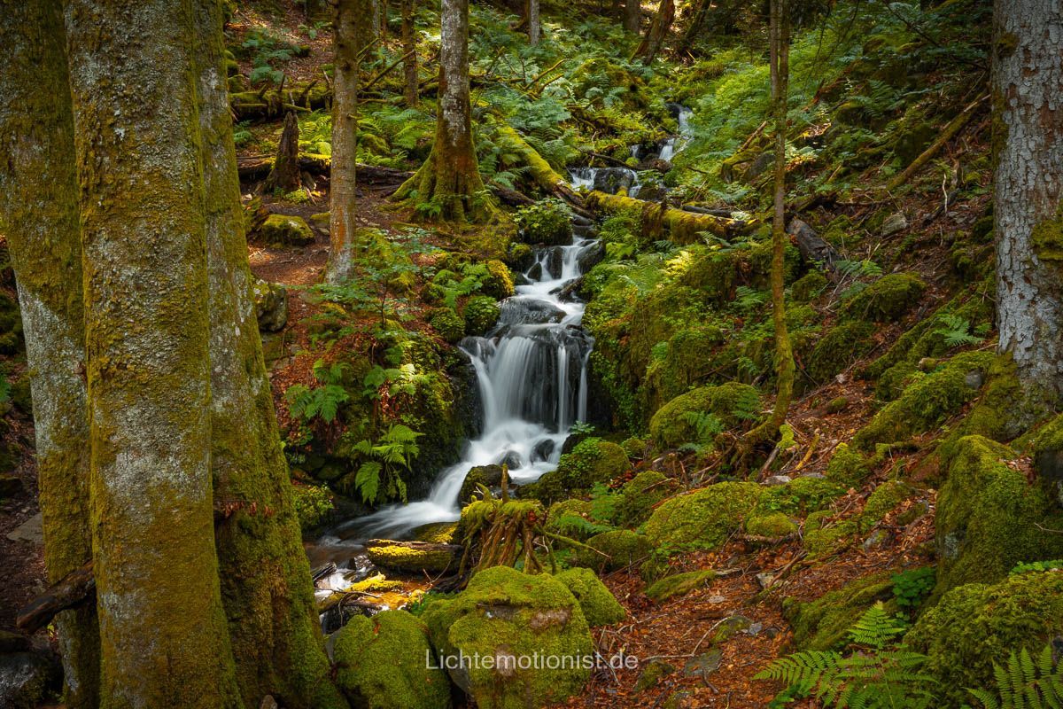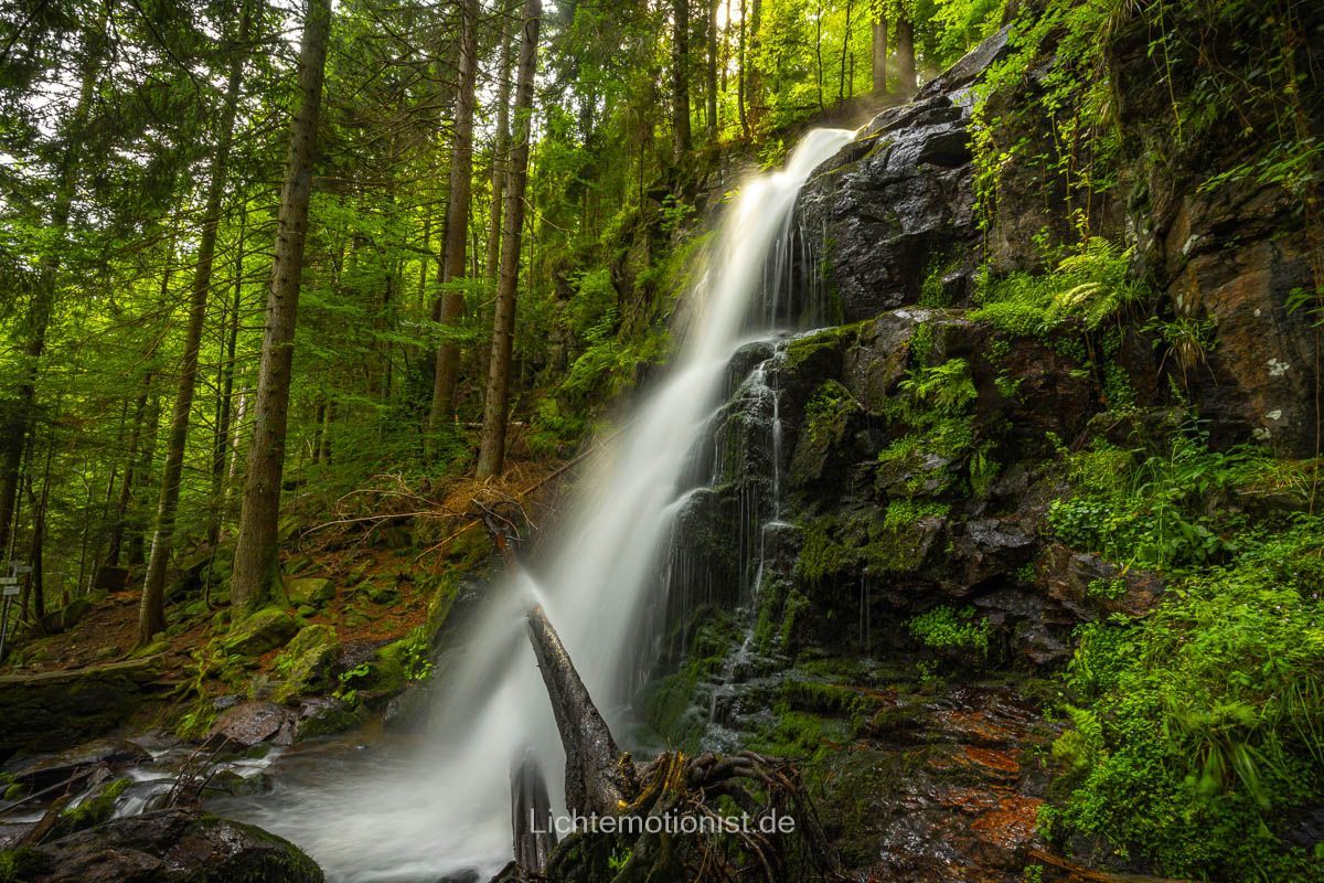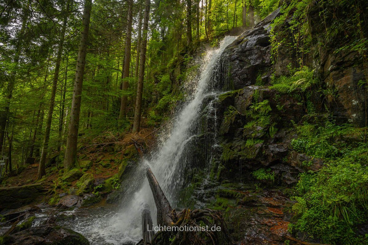 Nach unserer Pause ging es weiter hinab in die Schlucht. An einigen Stellen ist es ein bisschen knifflig, gute Schuhe sind auf jeden Fall empfehlenswert. Als wir endlich vor den Zweribachfällen standen, war sofort das Gefühl der Aufregung und Inspiration da: Wasser, Fels, Moos und das gleichmäßige Rauchen, das alles andere verstummen lässt. Etwa 20 Kilometer östlich von Freibrug fällt der Bach hier in drei Stufen in die Tiefe: unten der breite, kräftige Sturz, der durch die Felsen weit gefächert wird, in der Mitte eine kurze Kaskade und oben ein klarer Sprung. Wir standen einfach da, haben innegehalten. Die Luft war feucht und roch nach frisch, nassem Holz und man wird von feinen Wassertropfen überzogen. Das Licht wanderte durch die Bäume und gerade beim oberen Sturz hatten wir Glück, den genau als wir da waren leuchteten die Sonnenstrahlen durch die Bäume und ließen den Wasserfall teilweise erstrahlen. Man läuft von einem Sturz zum nächsten und alles lädt zum Verweilen ein und man bekommt viele Motive geboten, außerdem kann man hier mit Langzeitbelichtung spielen und einzigartige Bilder erzeugen.