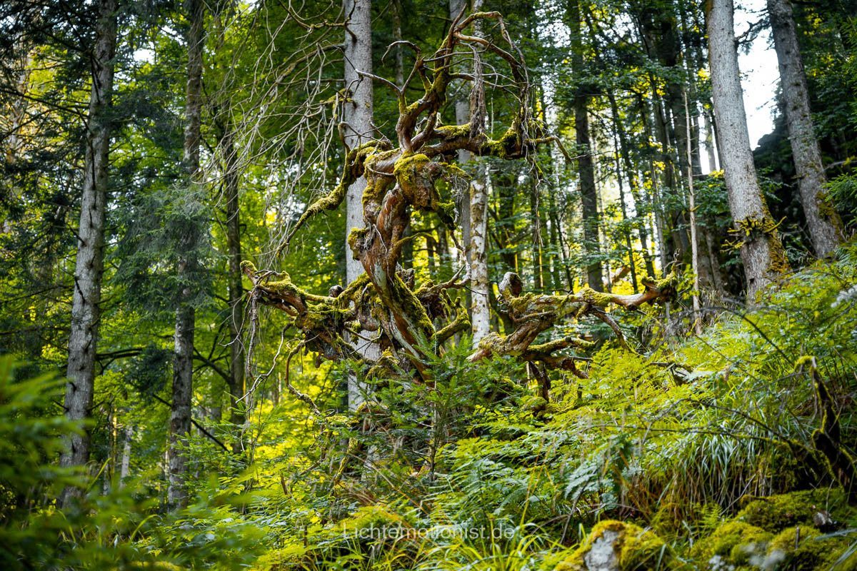 Der Bannwald hält Feuchte und Temperatur wie ein Schwamm. Das gedämpfte Licht, die kühle Luft und der stetige Sprühnebel schaffen ein Mikroklima, in dem Moose und Farne dichte Teppiche bilden, Totholz langsam zerfällt und Pilze das Holz Schritt für Schritt in neuen Boden verwandeln. Was für uns nach Ruhe aussieht, ist in Wahrheit ein sehr beschäftigtes System.