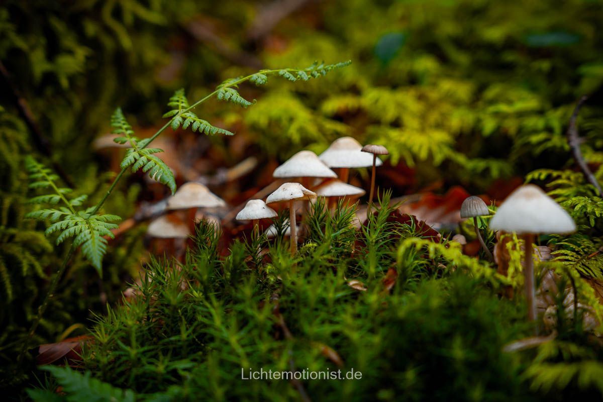 Viele Motive entdeckt man nicht im großen Panorama, sondern im Kleinen. Zwischen Farn, Moos und Schatten entstehen eigene kleine Welten, man muss nur in die Hocke gehen und die Perspektive wechseln. Achte auf Strukturen, Muster oder Formen, die aus der Umgebung herausstechen. Ein leicht offener Blendenwert (z. B. f/2.8 ) trennt das Hauptmotiv wie die Pilze hier vom Vorder- und Hintergrund und lenkt den Blick genau dorthin, wo die Geschichte beginnt: mitten im Detail.