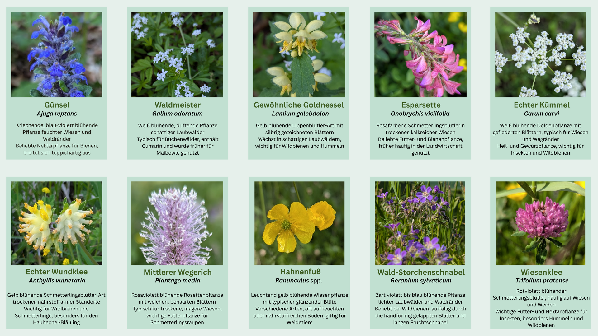 Wiesensalbei (Salvia pratensis): ist ein bis zu 60 cm hoher Lippenblütler, dessen blauen und lippenförmigen Blüten reichlich Nektar liefern und vor allem Hummeln, Wildbienen und Tagfalter anlocken. Als Charakterart nährstoffarmer, kalkreicher Mager- und Halbtrockenrasen gilt sein Vorkommen als Hinweis auf extensiv bewirtschaftete, artenreiche Wiesen. Dank kräftiger Pfahlwurzel ist er trockenheitsresistent, lockert den Boden und trägt zur Humusbildung bei. Aromatische Blätter liefern Futter für Raupen einiger Bläulingsarten und wurden traditionell als Heil- und Würzkraut genutzt.