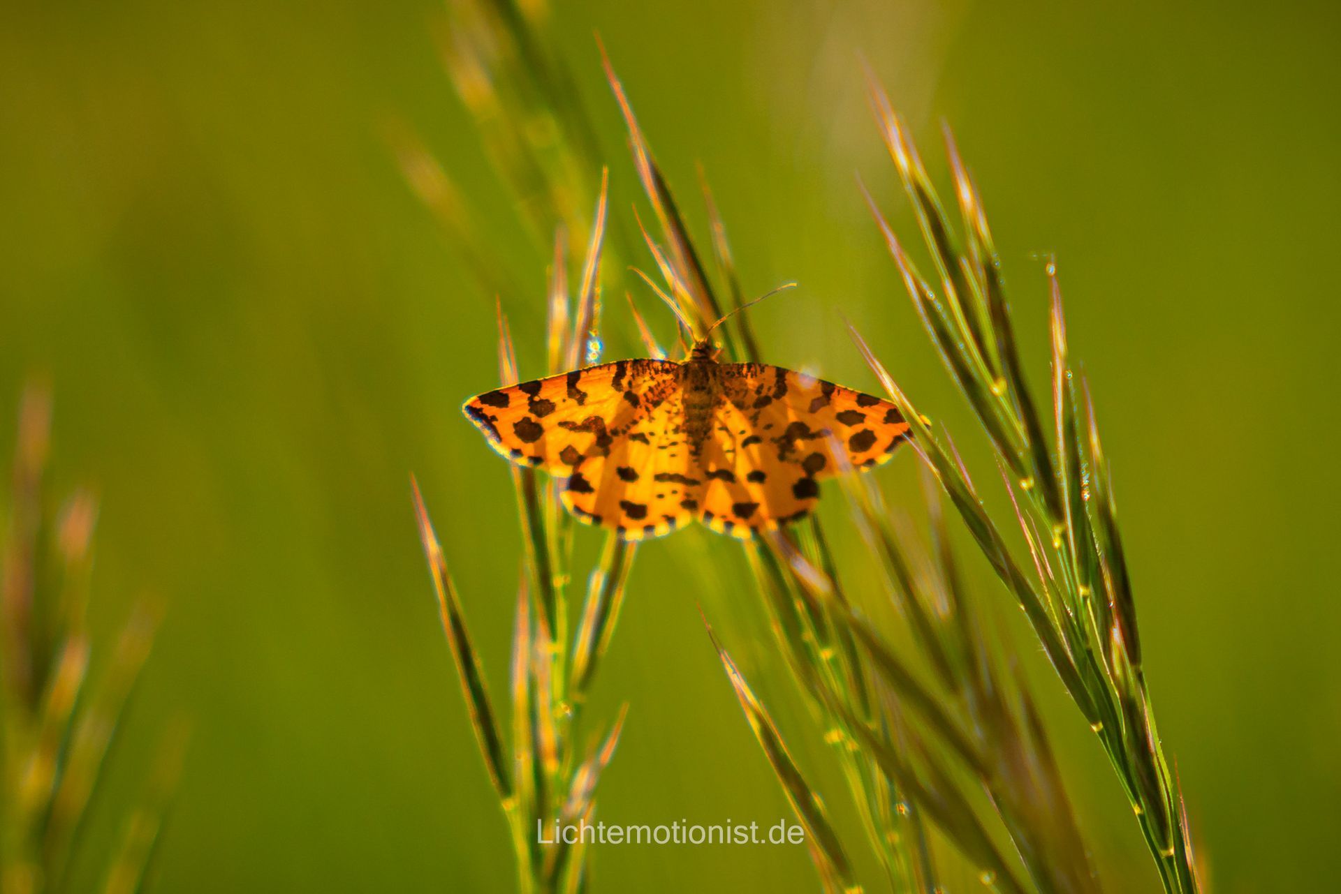 Pantherspanner (Pseudipanthera macularia): Der tagaktive Vertreter der Familie der Spanner fällt durch seine Flügelzeichnungen mit unregelmäßigen schwarzen Flecken auf. Diese optische Tarnung erinnert an das Fell eines Panthers und verleiht der Art ihren deutschen Namen. Die Flügel sind spitzzulaufend und haben eine recht kleine Spannweite. Den Schmetterling findet man auf mageren, blütenreichen Wiesen, lichten Waldsäumen und Halbtrockenrasen. Er ist allerdings auf eine strukturreiche Landschaft angewiesen. Ökologisch gesehen erfüllt er wie viele Schmetterlinge gleich mehrere Rollen. Als Pollensucher, trägt er zur Bestäubung bei, als Beuteorganismus ist er Teil der Nahrungskette für Vögel, Spinnen und Insektenjäger. Vor allem aber fungiert er als Bioindikator für intakte, extensiv genutzte Offenflächen.