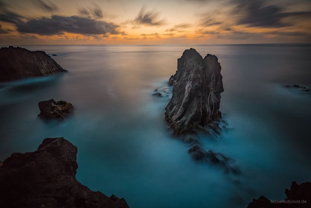 Darum herum: Wasser, das sich durch seine Bewegung in der Langzeitbelichtung zu einem nebelartigen Schleier verwandelt.