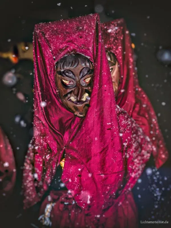 Der besondere Reiz im Jahr 2017 an diesen Abend gab es leichten Schneefall, der zusätzliches Stimmung, durch seine interessanten Lichtreflexe und Schneeflocken, in das Bild brachte. Maskenträger sehen schlecht durch die Masken und damit die nicht über mich stolpern, fotografiere ich mit einem 100 mm Objektiv. Einstellungen bei allen Bildern ISO400 1/200 f4 mit Aufsteckblitz.