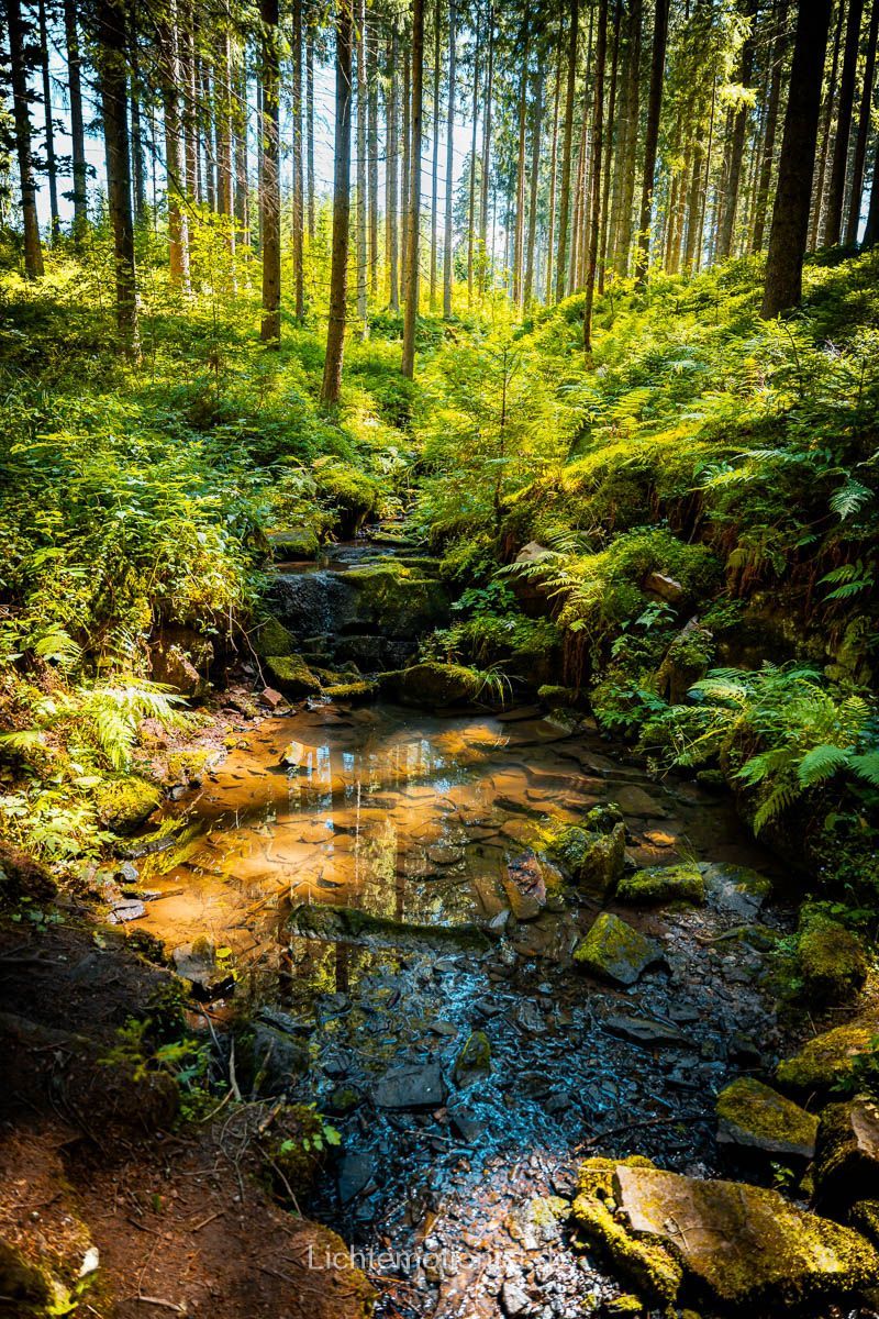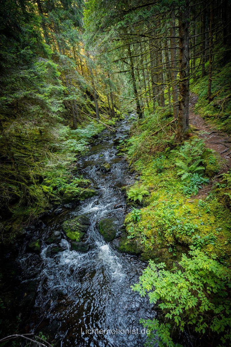 Schon wenige Meter nach dem Start taucht man in eine andere Welt ein. Der Wald nimmt einen auf und sofort verändert sich die Stimmung. Es wird ruhiger, das Rauschen der Straße verschwindet und das leise Murmeln des Baches dringt in den Vordergrund. Die Luft ist kühler, die Vegetation dichter, Moose und Farne überziehen den Waldboden.