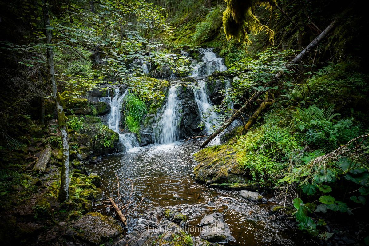 Nach einer Weile erreicht man die ersten Wasserfälle. Das Rauschen kündigt sich schon vorher an. Hier stürzt der Bach über Felsen, wirbelt in kleinen Becken und verschwindet wieder zwischen moosbewachsenen Steinen.