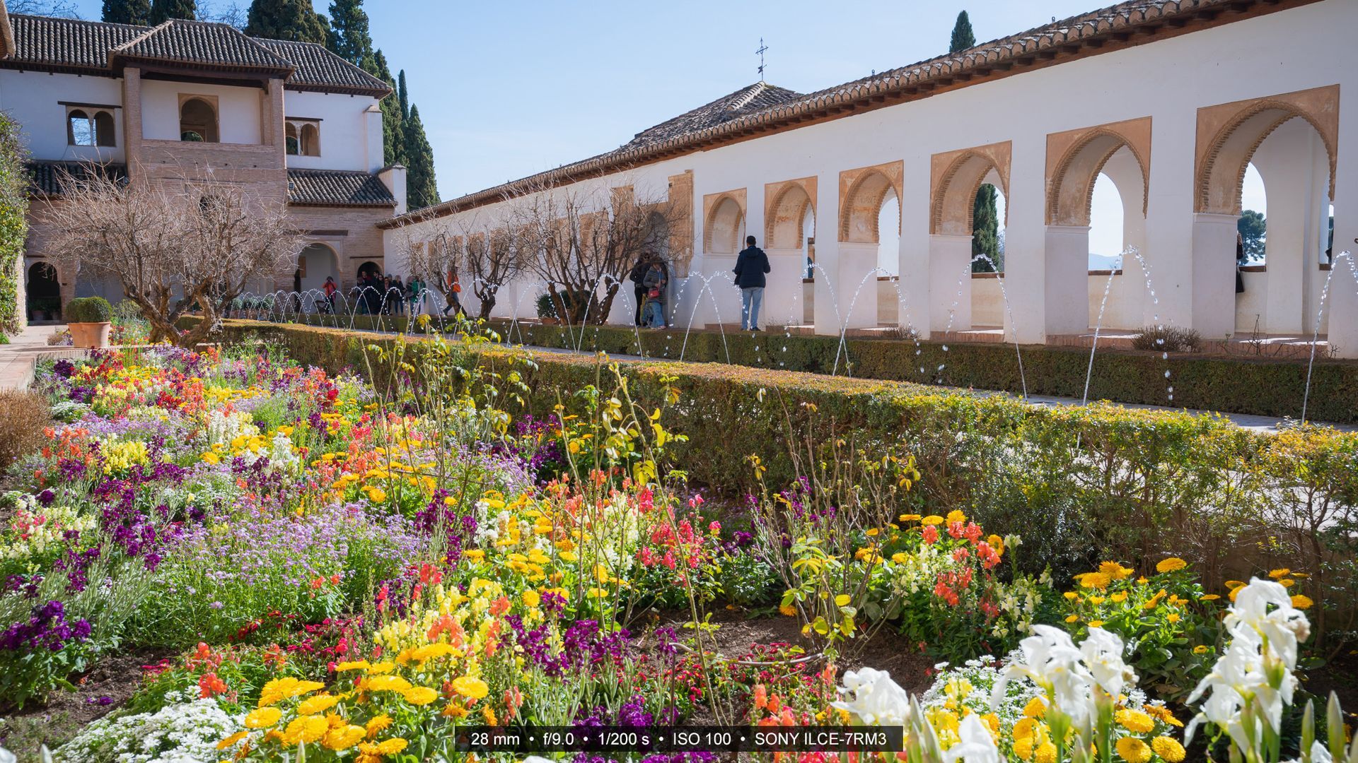 Der Generalife, genauer gesagt der Patio de la Acequia, ist der berühmteste Hof der Sommerresidenz der Nasridenherrscher innerhalb des Alhambra-Komplexes. Er liegt etwas abseits der Nasridenpaläste und war ursprünglich als Rückzugsort der Herrscher gedacht, ein Ort der Ruhe, Gärten, Wasserläufe und Arkadengänge. Ein langes Wasserbecken mit kleinen Springbrunnen zieht sich durch die Mitte, flankiert von farbenfrohen Blumenbeeten, akkurat geschnittenen Hecken und schattigen Wandelgängen.