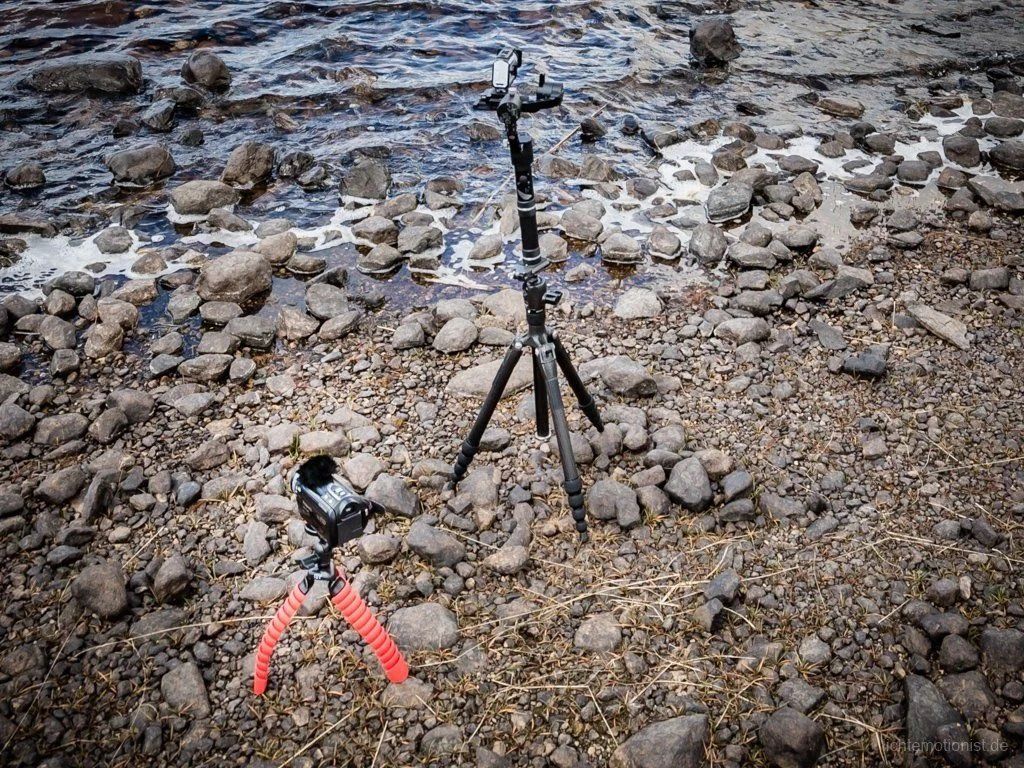 Was ich unterschätzt habe ist, gleichzeitig zu fotografieren und zu filmen, eine ganz schöne Werkelei, wenn man alleine unterwegs ist. Ein kleines rotes Stativ für meine Hauptvideokamera mit Klappdisplay und eine kleine ActionCam, die ich auf ein Gimbel montiert habe und bei diesem Bild zusätzlich noch auf mein Fotostativ geschraubt habe, helfen mir bei der Umsetzung.