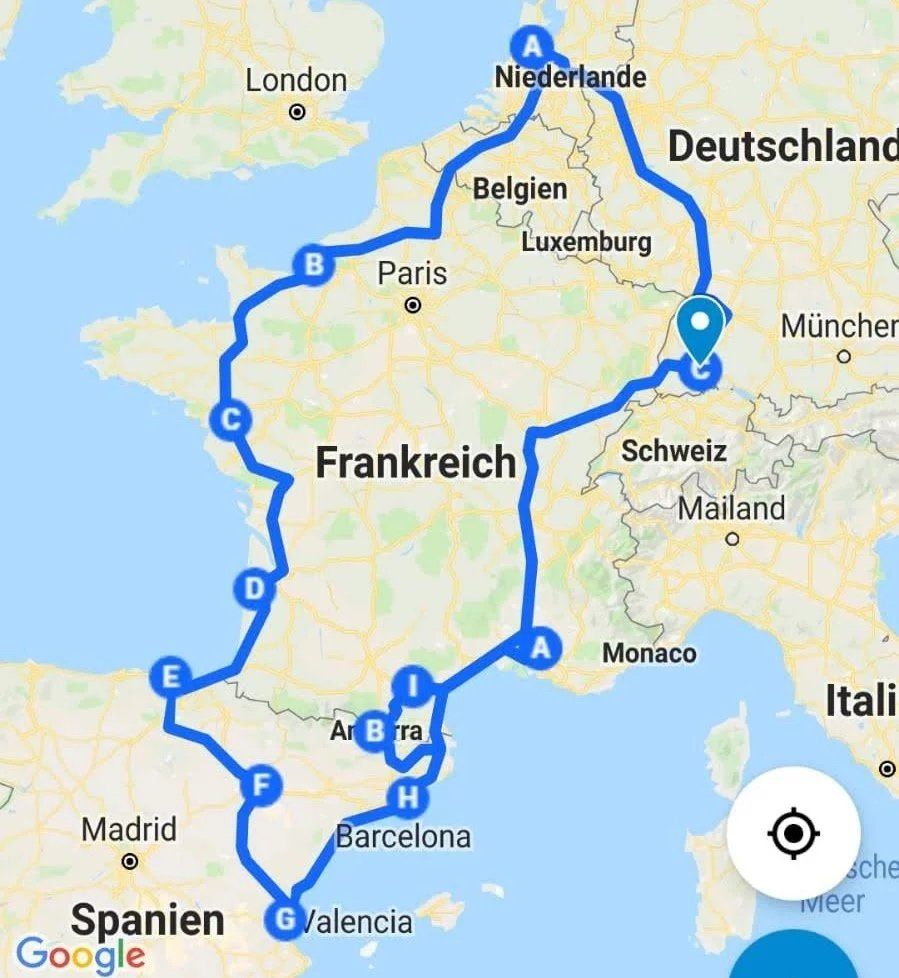 Unsere Reise beginnt im Westen von Süddeutschland in Donaueschingen. Über die Niederlande, Belgien, an der Nord- und Westküste Frankreichs entlang, einen kurzen Abstecher an die Nordküste Spaniens, dann zur spanischen Mittelmeerküste in Richtung Frankreich mit einem Abstecher nach Andorra, weiter durch Südfrankreich und zurück nach Donaueschingen.
