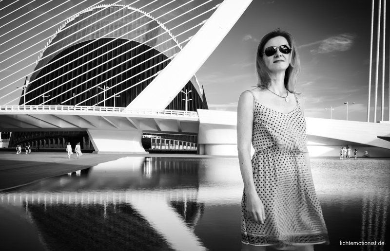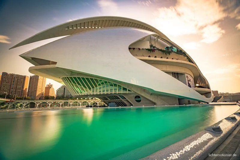 Als es gegen Abend kühler wird – heißt immer noch 28°C, laufen wir zur “Ciudad de las Artes y de las Ciencias” übersetzt, “die Stadt der Künste und der Wissenschaften”. Die futuristische Architektur ist beeindruckend und es kommt noch ein sensationeller Sonnenuntergang dazu, zusammen mit der Spiegelung in den Wasserbecken, an den Gebäuden, gibt das tolle Lichterspiele für den Lichtemotionist 😀