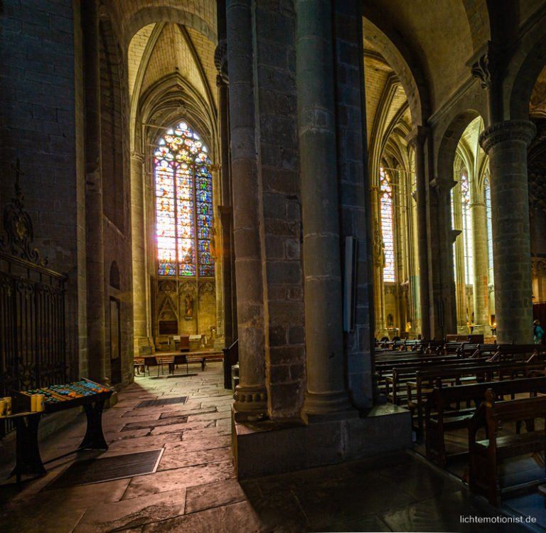 Hier hat es auch noch einen wunscherschönen Kirchenbau die “Basilika St-Nazaire-St-Celse”. Die Lichtstimmung in der Kirche ist außergewöhnlich faszinierend. Die Tonwerte sind eine Herausforderung, um diese etwas in den Griff zu bekommen arbeite ich mit Reihenbelichtungen. Damit kann ich dann in der Bildentwicklung das Maximale aus dem Bildmaterial holen.