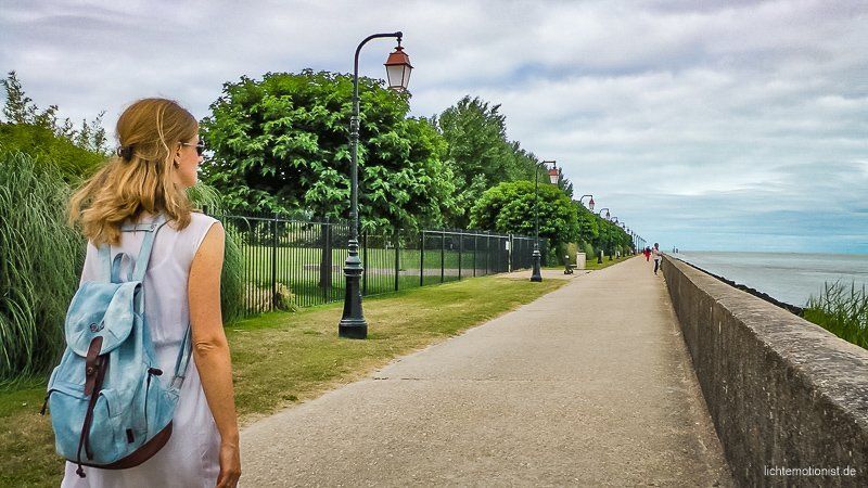 Dann laufen wir weiter durch die Stadt zur Hafenpromenade, schauen den Booten beim Ein- und Ausfahren zu. Wir spazieren an der Promenade entlang weiter zum Strand. Dieser ist ein ganzes Stück von der Innenstadt entfernt. Es ist gerade Ebbe und das Wetter lädt nicht sehr zum Baden ein. Trotzdem sind einige Menschen im Wasser. Brrrr.