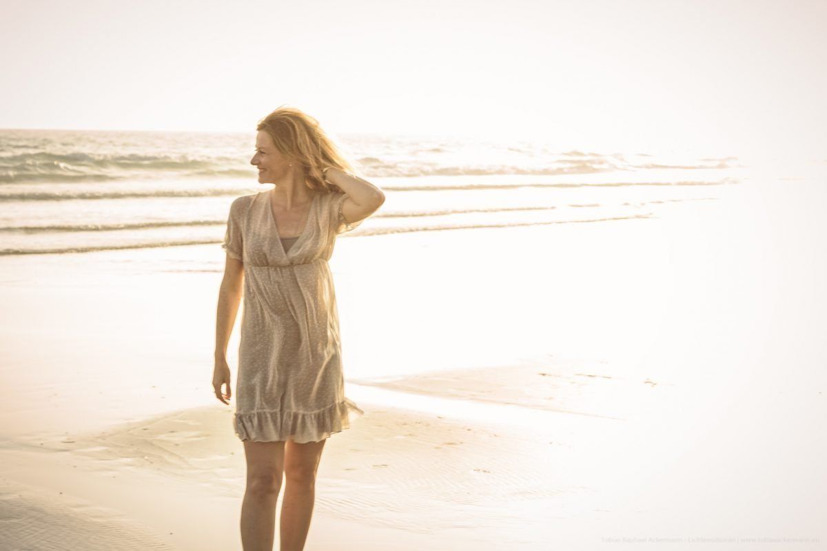 Bei einer leichten Überbelichtung wirken Personen jünger, denn Falten werden viel dezenter wiedergegeben. Auch der Hintergrund sollte vorwiegend hell sein, am besten gegen die Sonnen fotografieren und die Spiegelung des abziehenden Wassers am Strand mit nutzen.