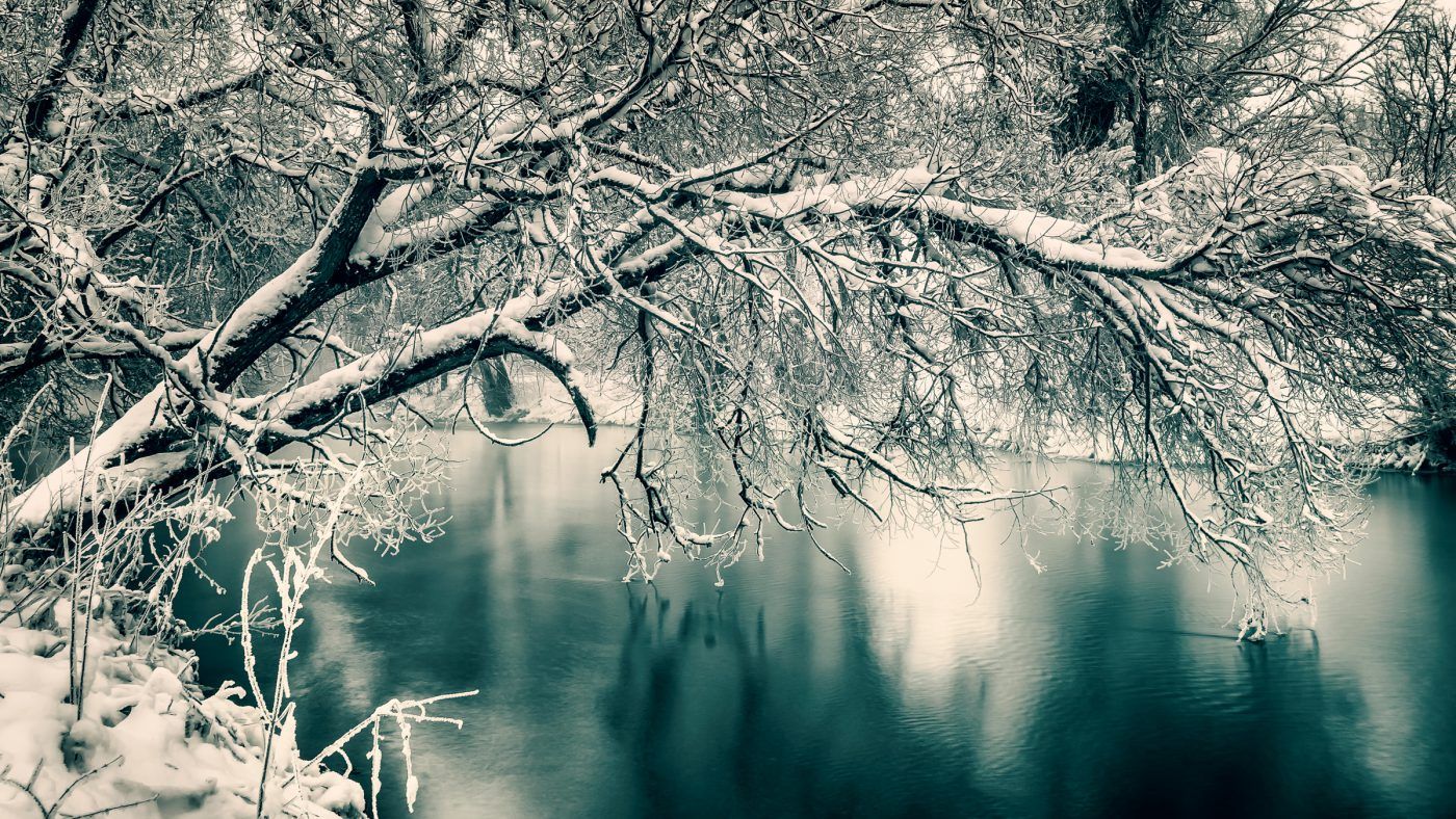 Auch wieder von der Brücke, diesmal wieder in die Richtung wie das erste Bild. Mittlerweile wurden die Wolken dichter, die Sonne war nicht mehr zusehen. Nun mit einer „Langzeitbelichtung“ 4 Sekunden, dazu bin ich auf Blende 16, das erspart mir bei der Kälte einen Graufilter (ND) auf das Objektiv zu schrauben. Der Himmel war in diesem Fall nicht mehr Teil der Bildidee, sondern der Fluss und die schneebedeckten Zweige. Um näher am Motiv zu sein, habe ich hier mein Zoom auf 105 mm eingestellt.